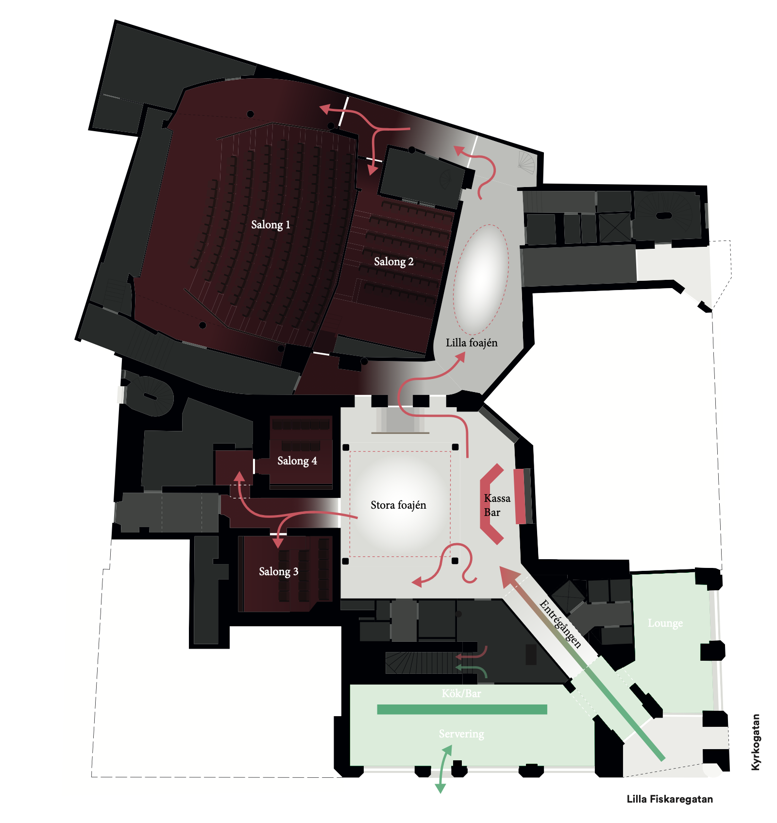 Bilden visar en övergripande konceptlayout av det nya Filmhuset KiNO som öppnade 15 mars 2025. Den gamla biografen utgjordes av de delar högst upp i bilden som heter “Salong 1, Salong 2 och Lilla foajén”, resten är de nya delarna i den gamla banklokalen.
