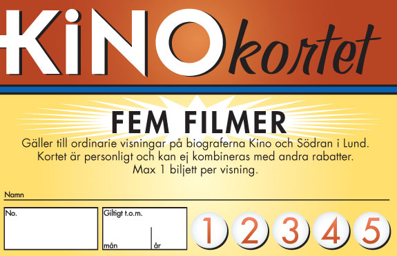 För dig som går ofta på bio erbjuder vi ett klippkort, Kinokortet, som ger förmånlig rabatt. Det kan köpas av vem som helst och gäller både på Kino och Södran. Kinokortet är ett förköpskort för fem filmer. Det kostar 525 kronor (du sparar 150-225 kronor mot Kinos ordinarie priser). Kortet gäller i 12 månader till valfria föreställningar på den ordinarie repertoaren, dock ej livesändningar (och dess repriser) och eventuella uthyrningar till filmfestivaler samt vissa specialarrangemang. Kortet är personligt (du kan alltså bara göra ett klipp på kortet per visning). Kinokortet köper du i kassan på Kino!