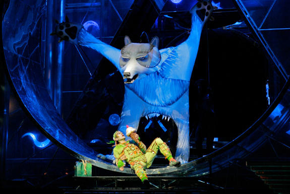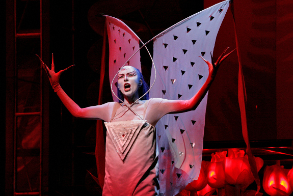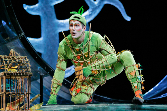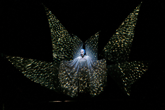 Julie Taymors visuellt anslående, kritikerhyllade uppsättning av Mozarts Trollflöjten (sjungen på engelska) var den allra första direktsändningen från Met. Scenografi och kostym är också skapade av Taymor och det är full fart på scen tack vare ett antal duktiga dockförare som kontrollerar en myriad av rekvisita, allt från flygande fåglar, bestialiska isbjörnar och stora hägrar, till tallrikar med spaghetti, korv och vin. Scenografin är som en blandning av Ming-dynastin och science fiction.